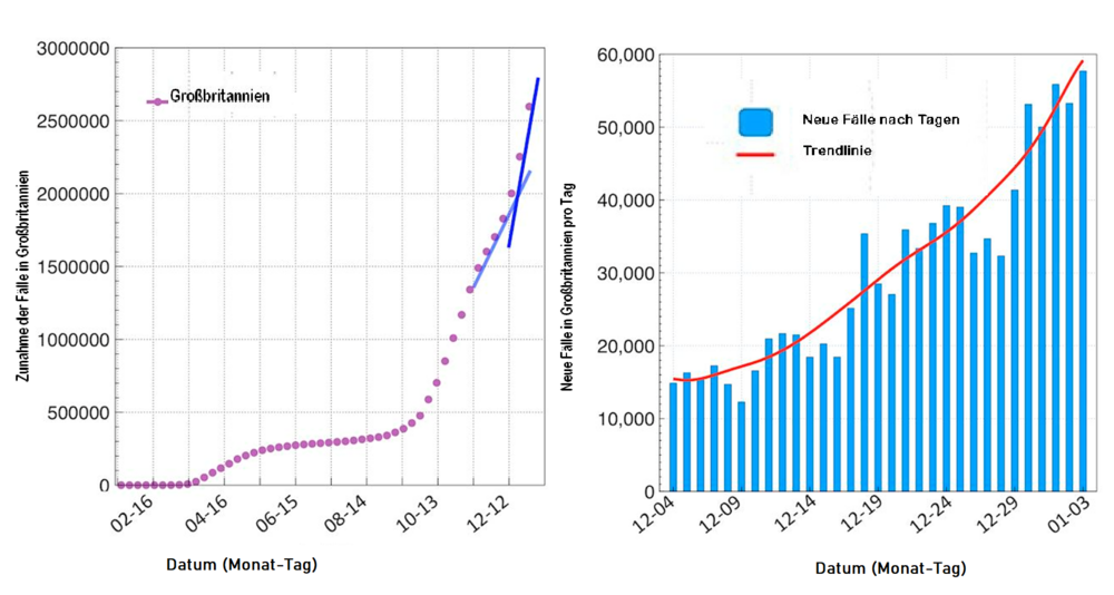 Laut dem linken Diagramm in der folgenden Abbildung waren die gesamten Coronavirus-Fälle in Großbritannien im Jahr 2020 zwischen April und Oktober relativ stabil (250.000 bis Mitte Mai, fast 2.000 pro Tag). Aber zwischen Oktober und Dezember wurden in nur 2,5 Monaten insgesamt 1,5 Millionen mehr Fälle gemeldet (fast 20.000 Neuinfektionen pro Tag). Noch schneller wuchs die Anzahl der Neuinfektionen von Dezember 2020 bis Januar 2021.
