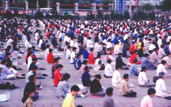 Hunderte Menschen übten vor dem Beginn der Verfolgung von Falun Gong in der Stadt Mudanjiang täglich die Meditation. Nachdem Jiang Zemin und die KP Chinas 1999 begonnen haben, diese Menschen zu verfolgen, gehören solche Bilder der Vergangenheit an.
