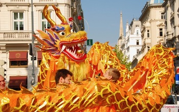 Parade für Menschenrechte durch Wiens Innenstadt - Der chinesische Drache tanzt wieder durch Wiens Innenstadt, angeführt von der „European Tian Guo Marching Band"